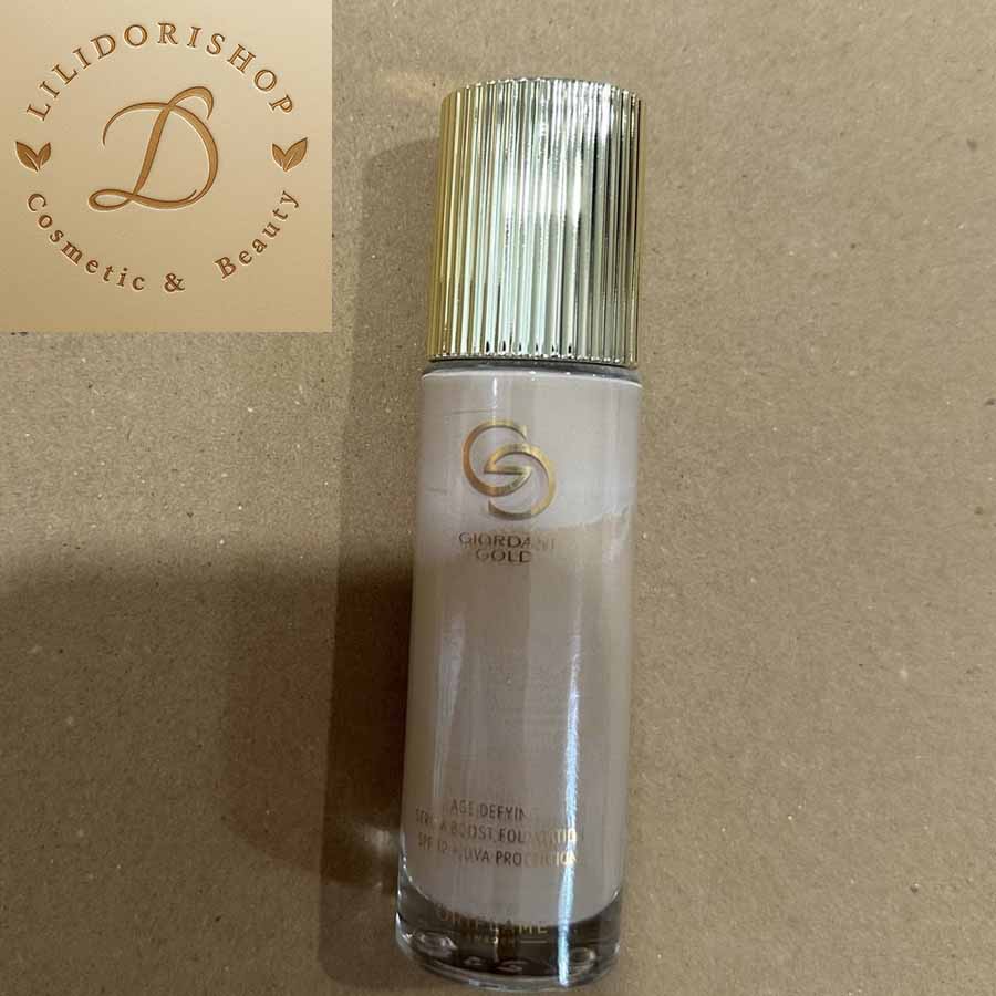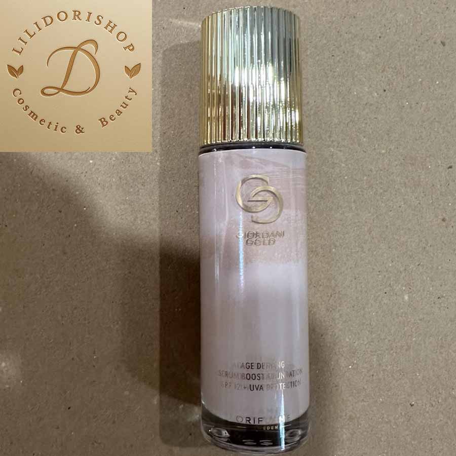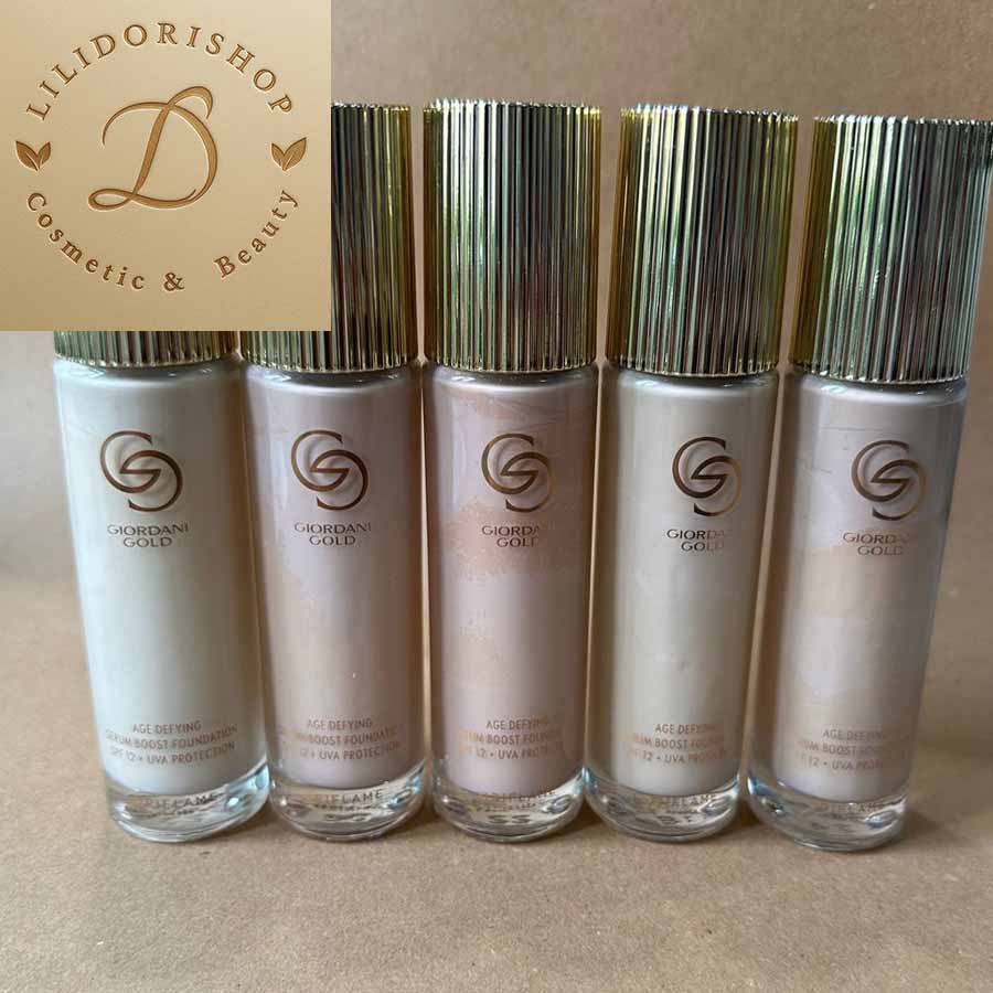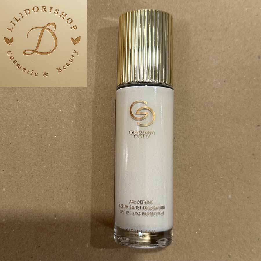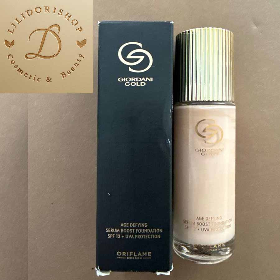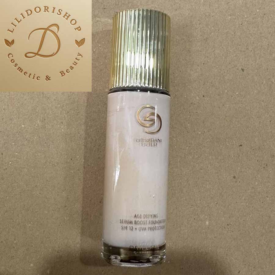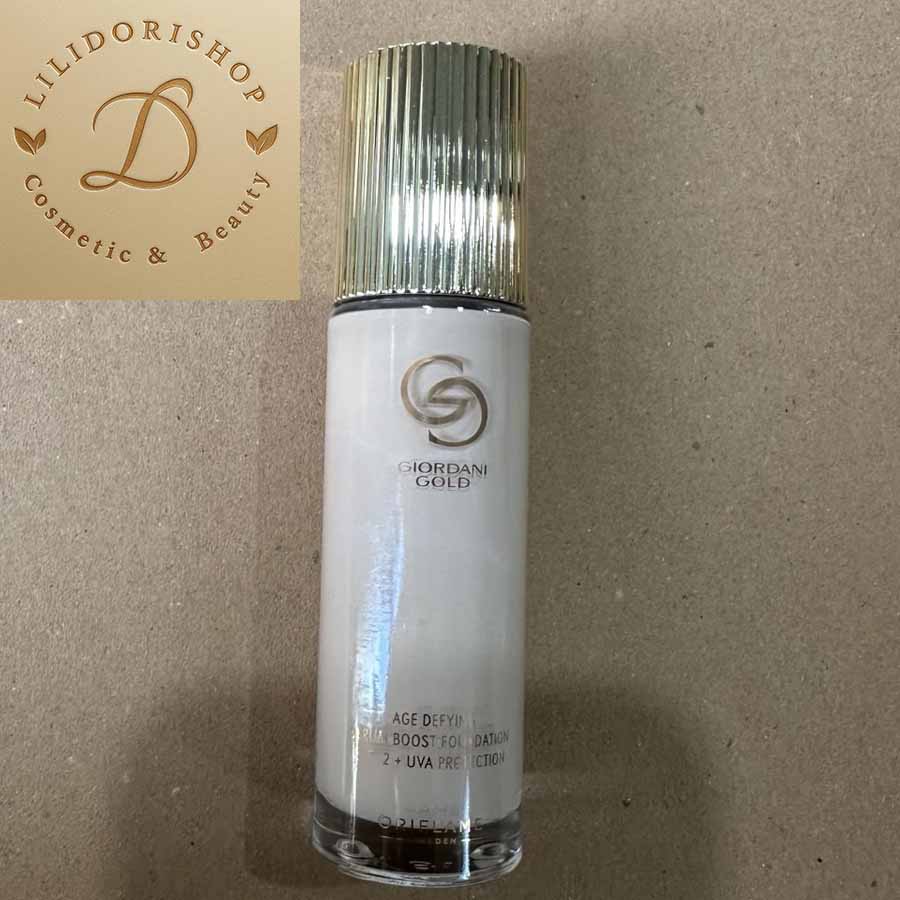 Giordani Gold Age Defying Serum Boost Foundation از سری لوکس Giordani Gold اوریفلیم، یک کرمپودر مایع با فرمول ضدپیری و غنیشده با سرم جوانساز است. این محصول علاوه بر پوشش طبیعی و صاف، با SPF 12 و محافظت UVA از پوست در برابر اشعههای مضر خورشید محافظت میکند.